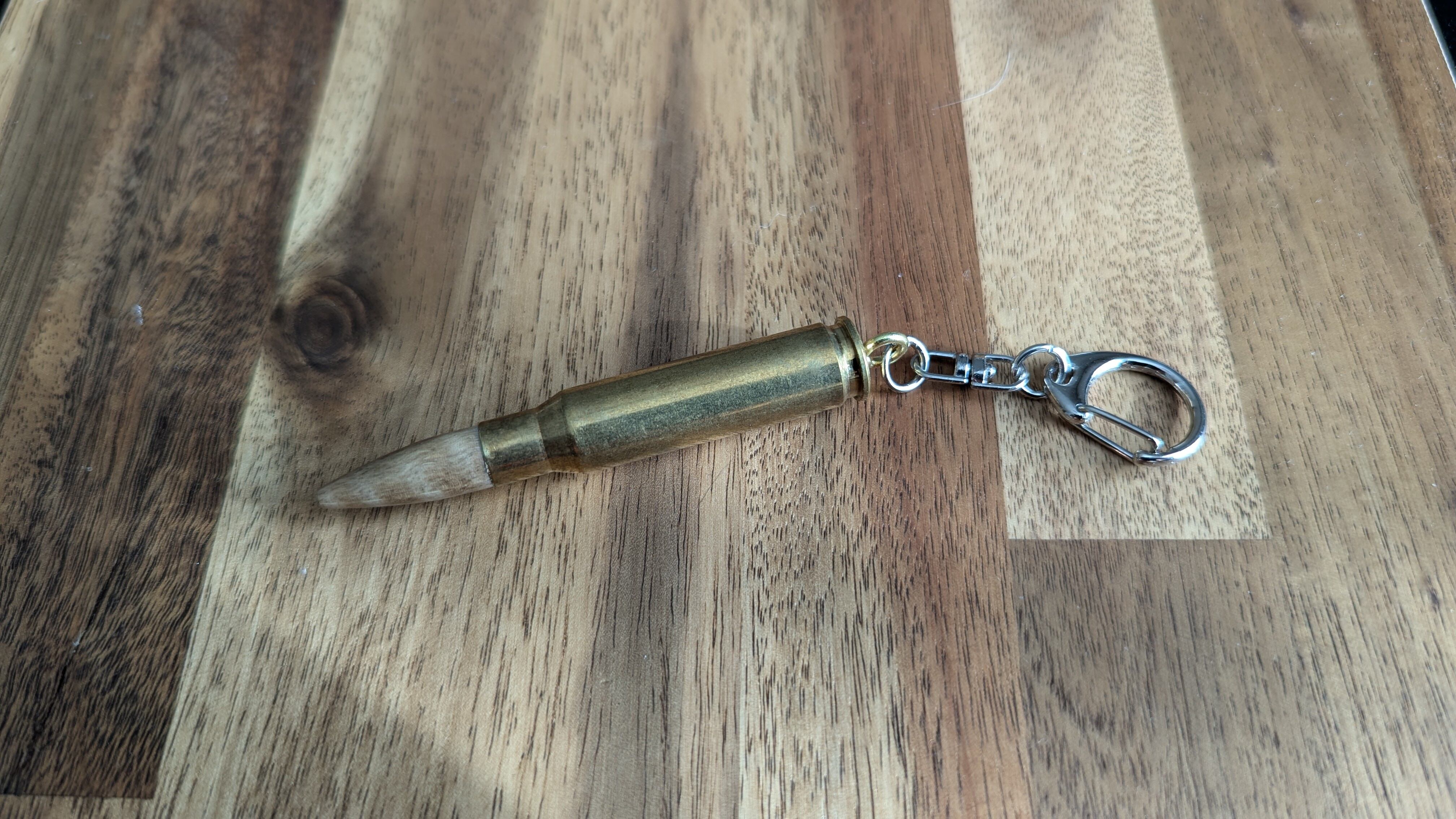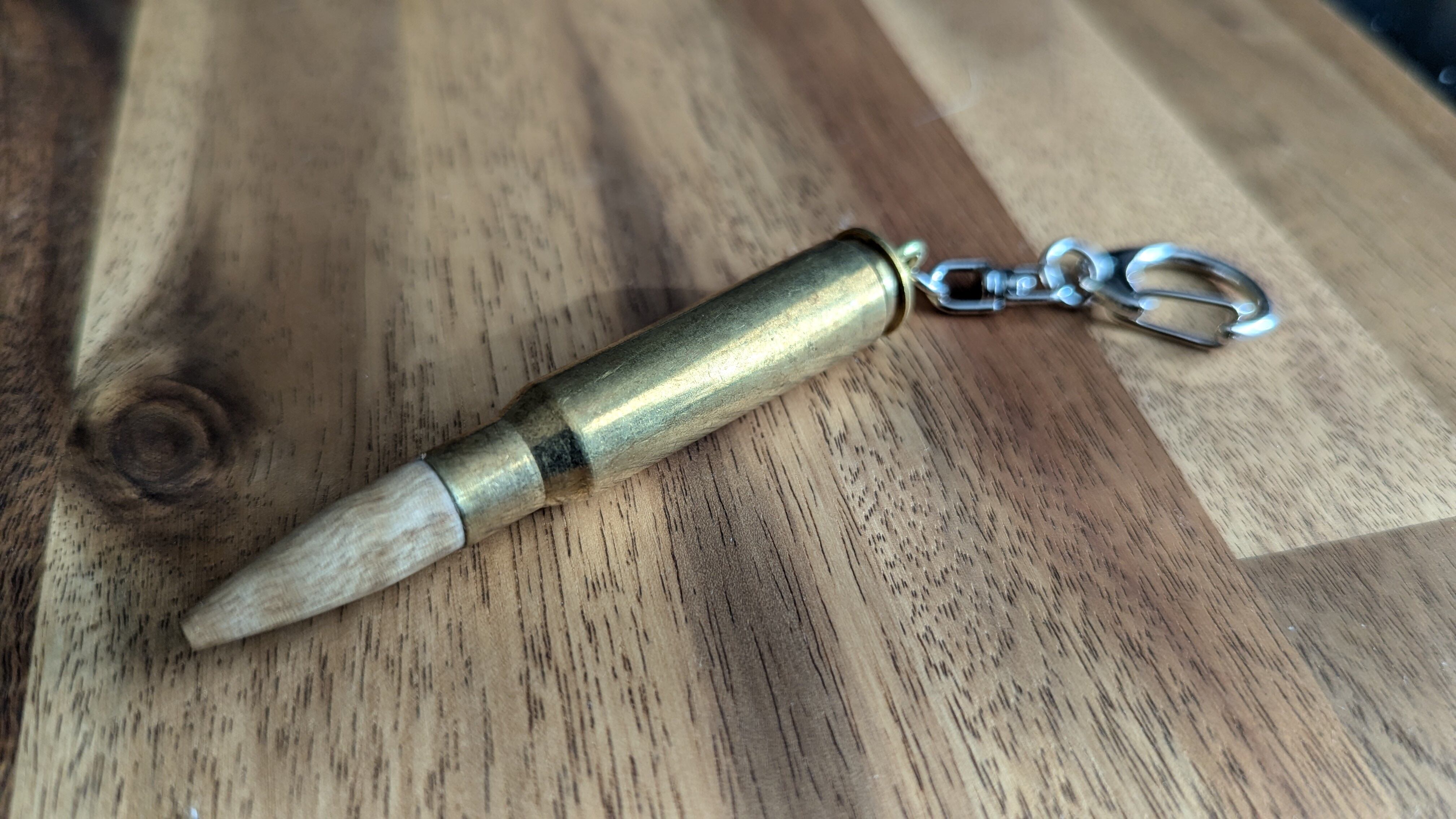 このアクセサリーは、狩猟用ライフル弾の空薬莢に、弾頭を模した木製パーツ(柿)を組み合わせたハンドメイドアクセサリーです。